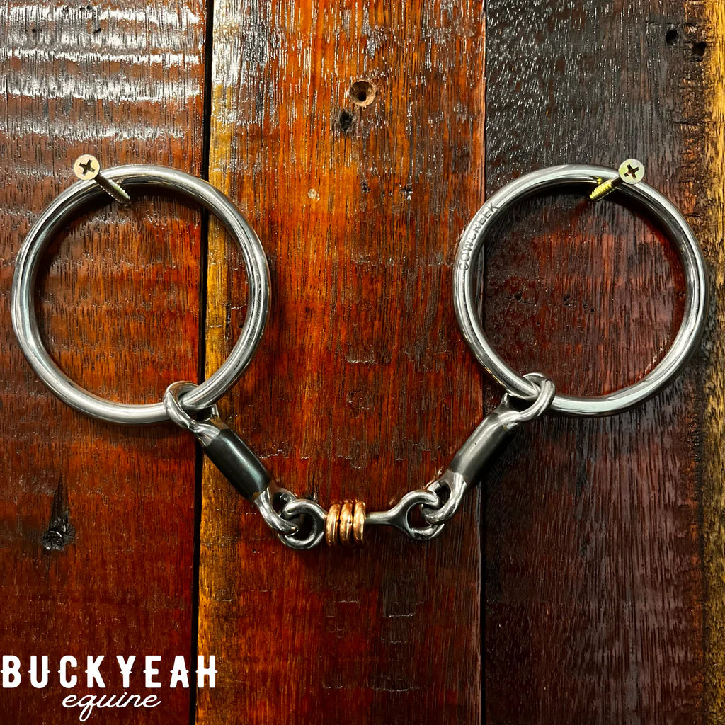 Twisted with Copper Twisted Inlay- The curved twisted mouthpiece is more effective across the bars without being to sharp. The small amount of copper encourages the horse to relax and salivate, without being too stimulating or distracting. The mouthpiece will help with a horse that is leaning on the bit or developing resistance. For a barrel racing horse it will help with rate and flex