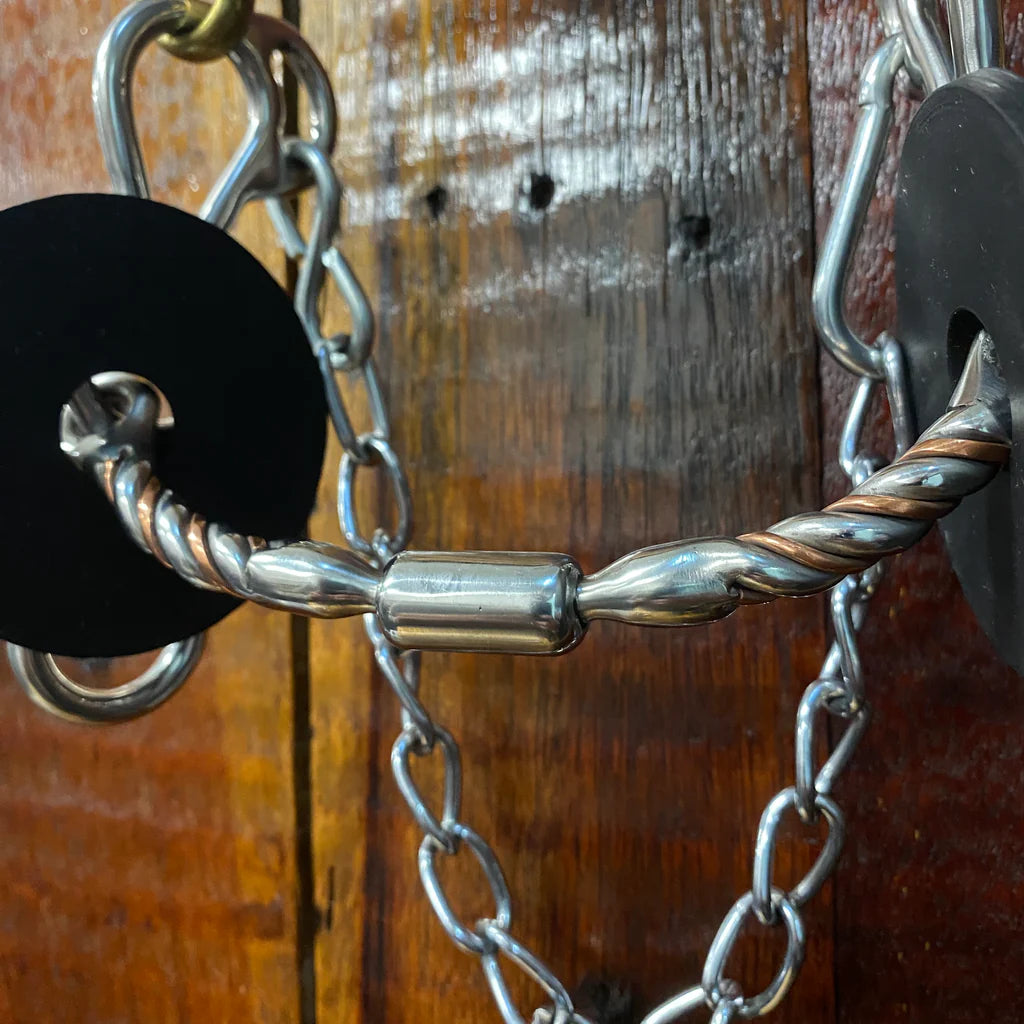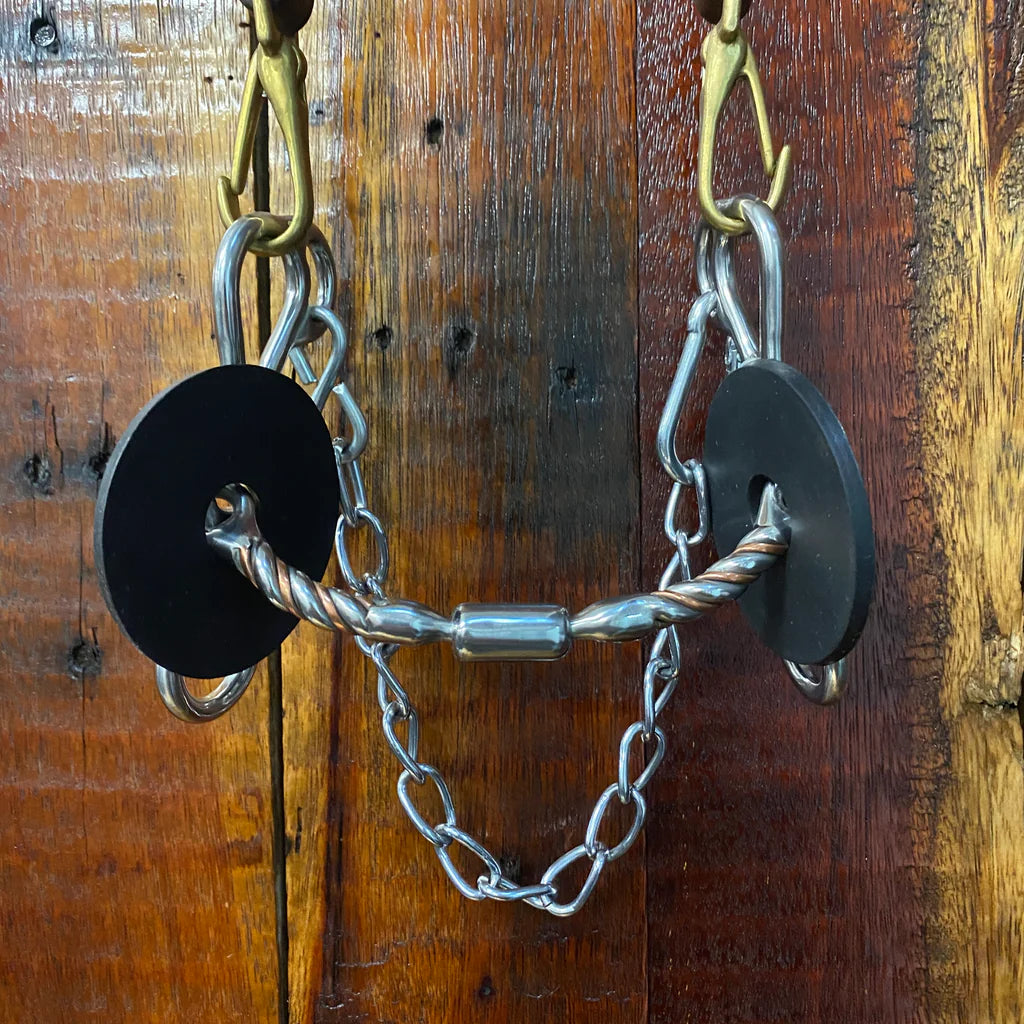 The curved (Myler) mouthpiece and center barrel are made of stainless steel with a twisted copper inlay. The curve allows even pressure distribution across the tongue. The center barrel protects the tongue from being pinched in the center joint. The small amount of copper encourages the horse to relax and salivate, without being too stimulating or distracting.