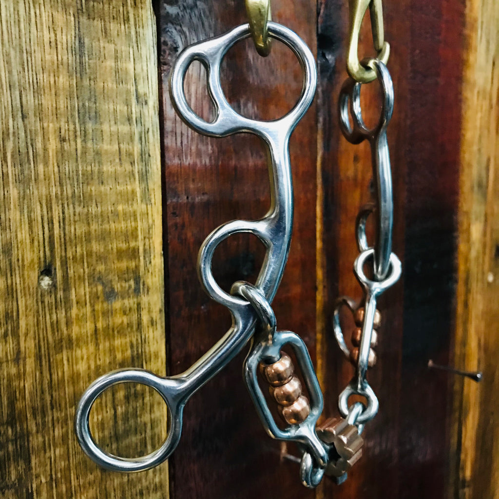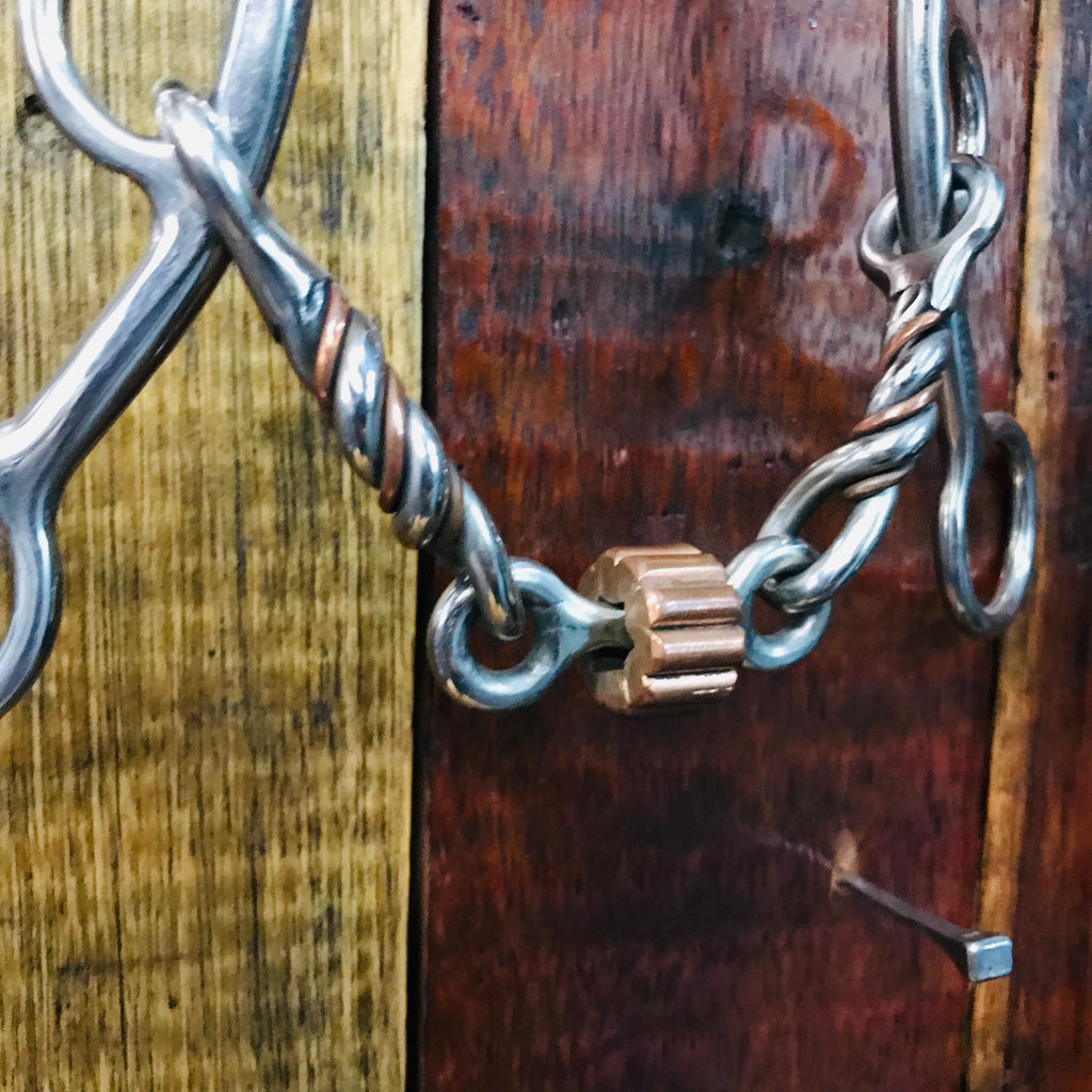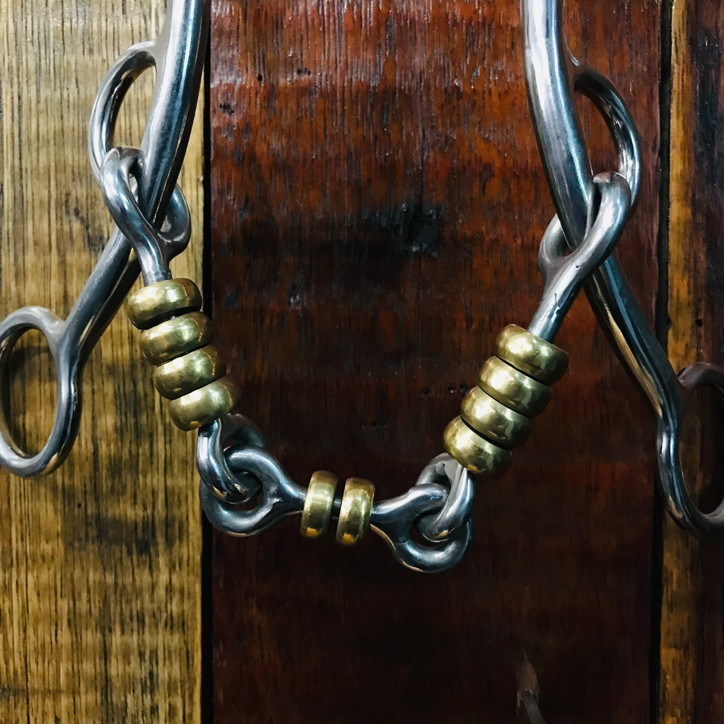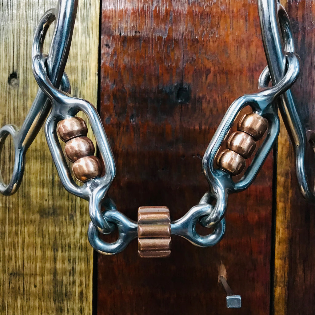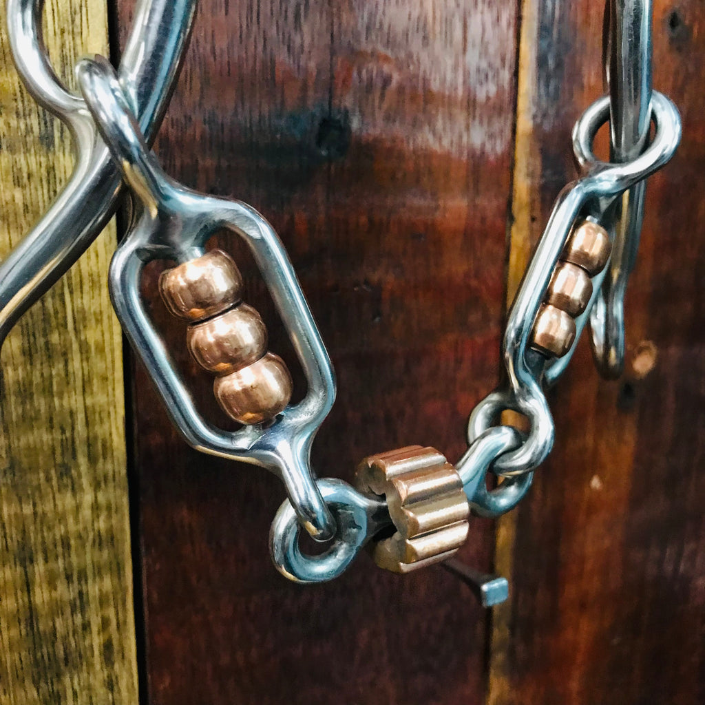 3 Piece with Copper Beads- The copper beads increases salivation which naturally relaxes the jaw. The beads also roll which reduces pressure on the bars of the mouth, concentrating the contact more on the tongue.