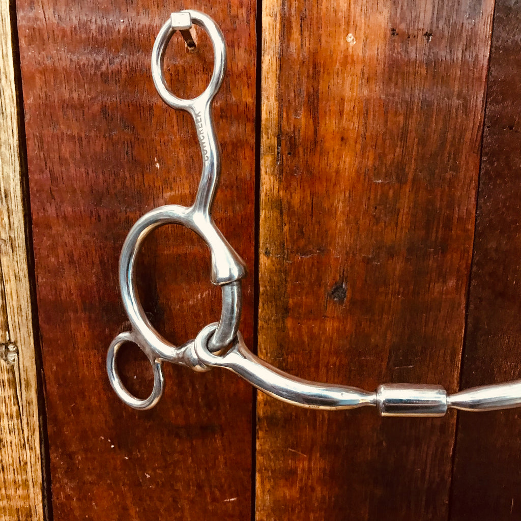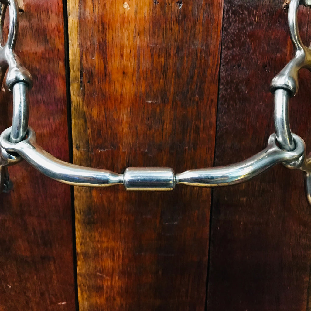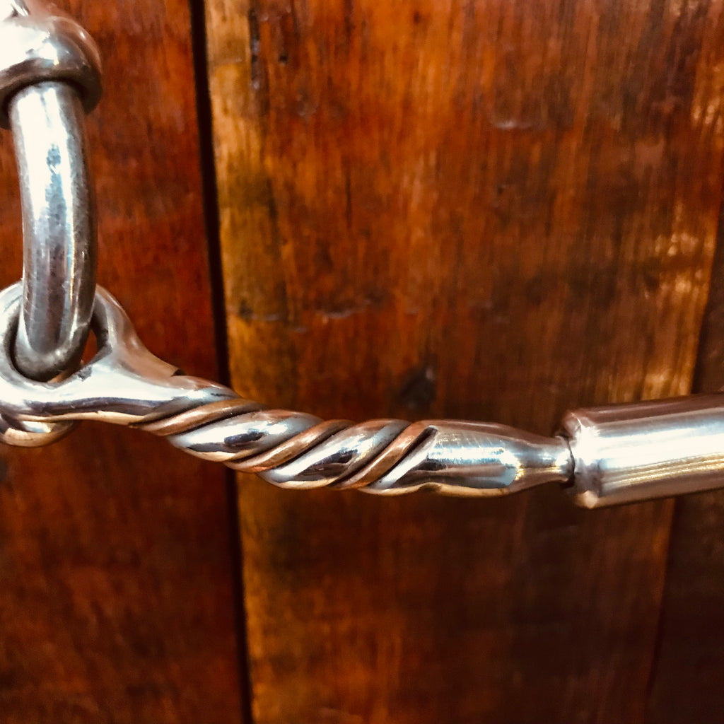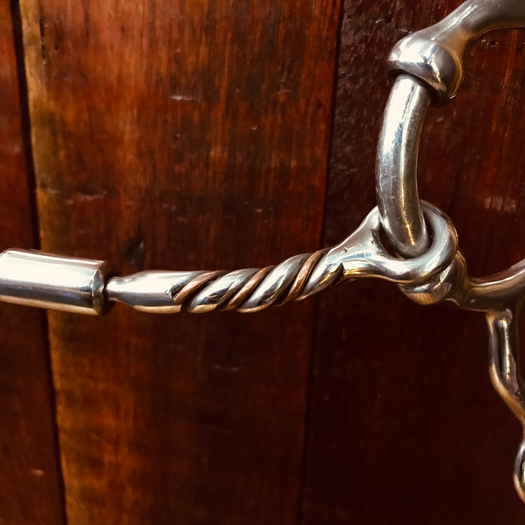 The curved (Myler) mouthpiece and center barrel are made of stainless steel with a twisted copper inlay. The curve allows even pressure distribution across the tongue. The center barrel protects the tongue from being pinched in the center joint. The small amount of copper encourages the horse to relax and salivate, without being too stimulating or distracting.