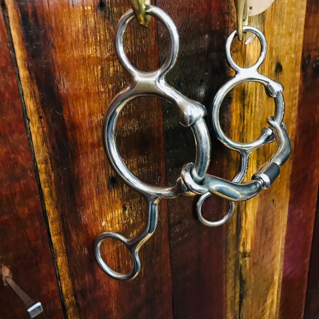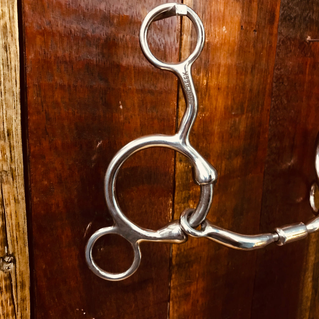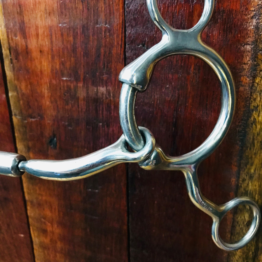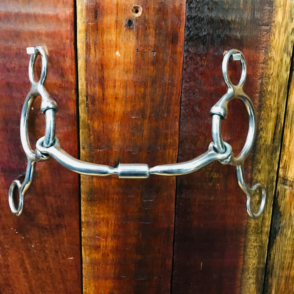 The curved (Myler) mouthpiece and center barrel are made of stainless steel with a twisted copper inlay. The curve allows even pressure distribution across the tongue. The center barrel protects the tongue from being pinched in the center joint. The small amount of copper encourages the horse to relax and salivate, without being too stimulating or distracting.