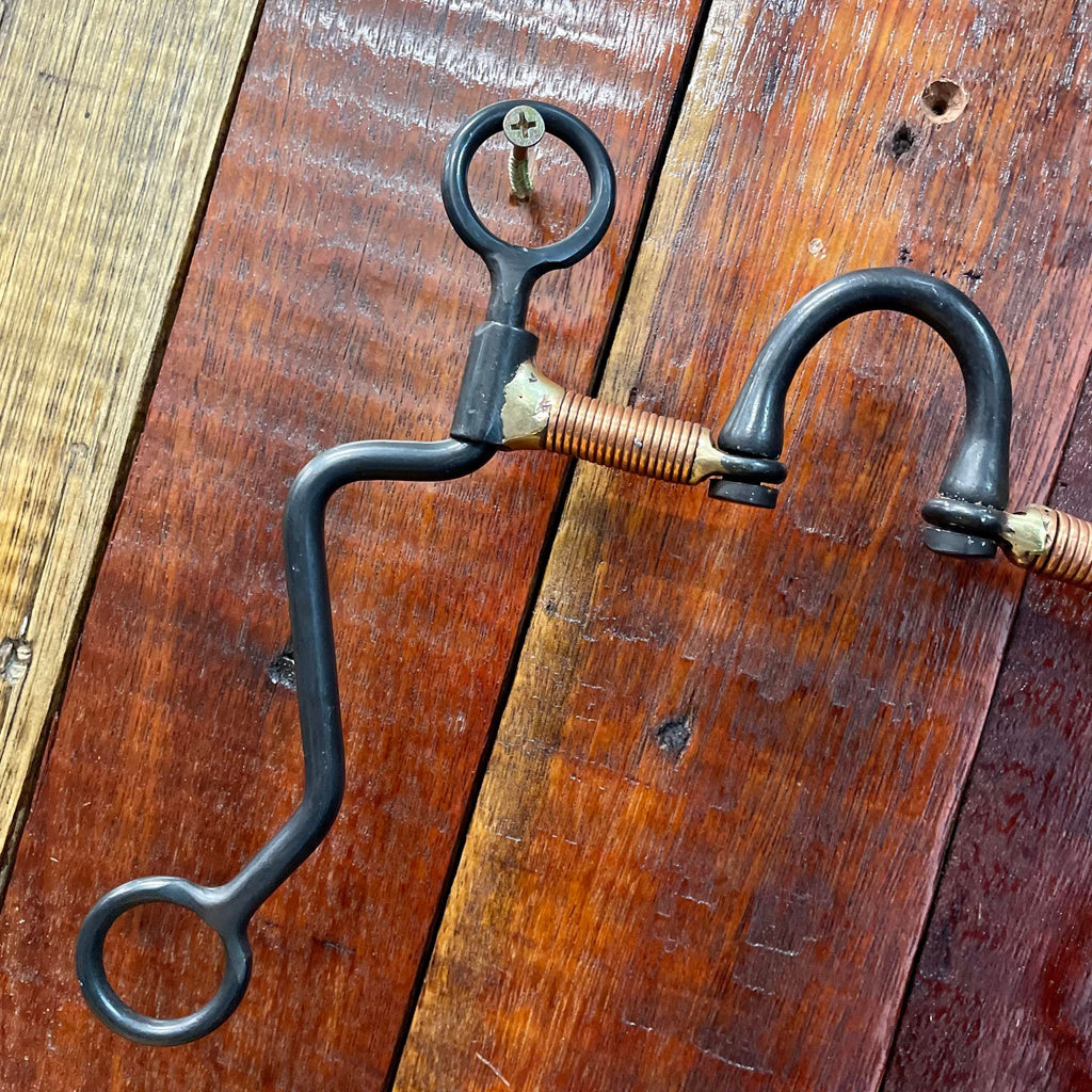 This is a strong leverage bit, designed to establish control. 8' Black steel cheeks. 5" double hinged mouthpiece. Featuring a long barrel "No pinch" Where mouth attaches to cheek.