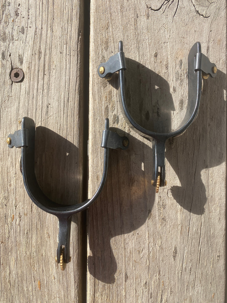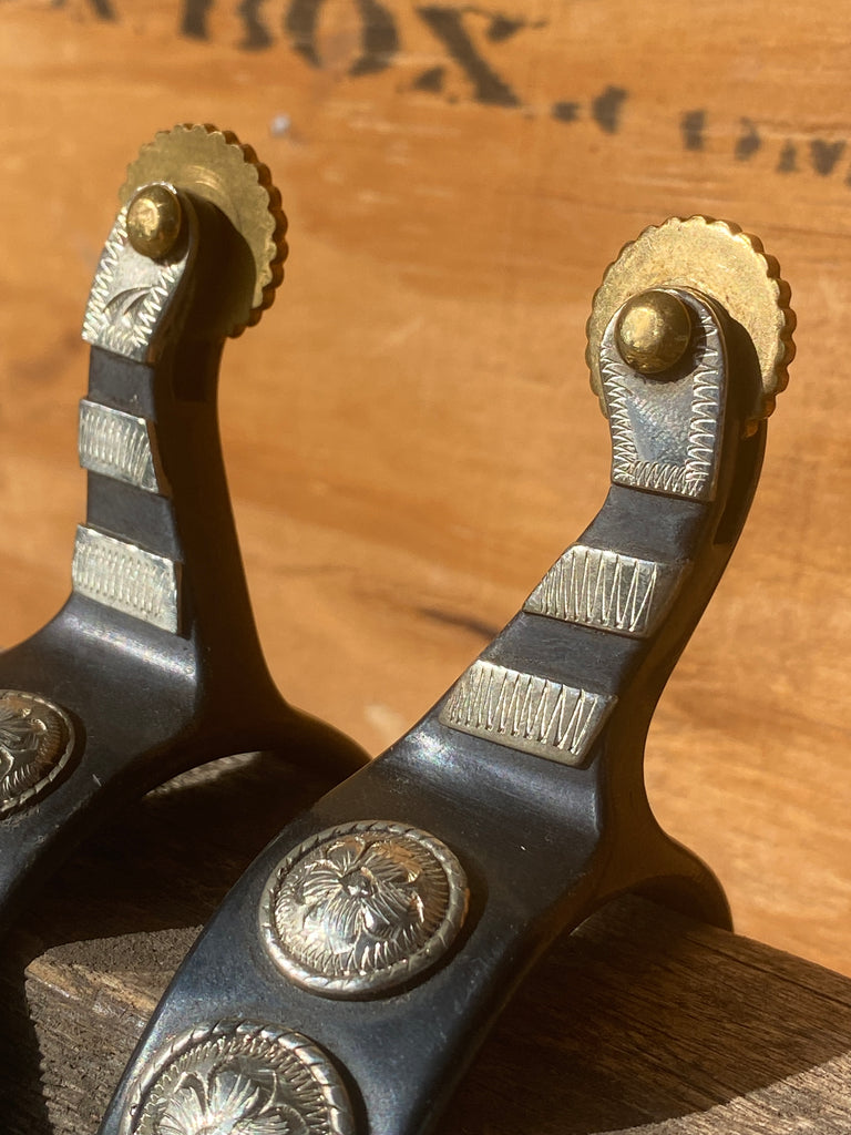 Ladies Roping Spurs with silver accents, gold rowels and gold strap buttons.